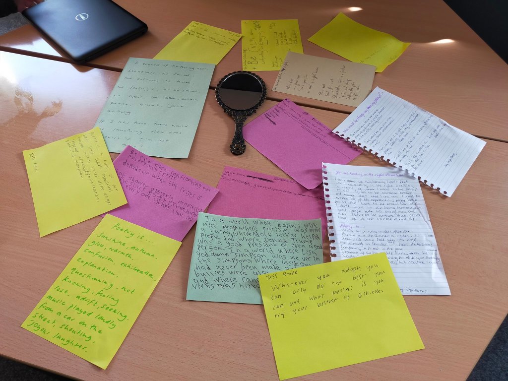 I was commissioned to run a workshop as part of Ripon Poetry Festival 2021, curated by Andy Croft, which featured poets Simon Armitage and Helen Mort and attracted over 700 attendees. I worked with the students and staff at Evolve – a small college in the centre of Ripon which provides an alternative to a large campus for full-time students in a supportive, friendly and inclusive environment. The theme for the festival was ‘The Other Side of the Looking Glass’, in celebration of the 150th birthday of Lewis Carroll’s sequel to Alice in Wonderland. In the workshop we made a group poem made up of lines finding beauty in the everyday, then took an imaginative journey through the looking glass to create alternative worlds.