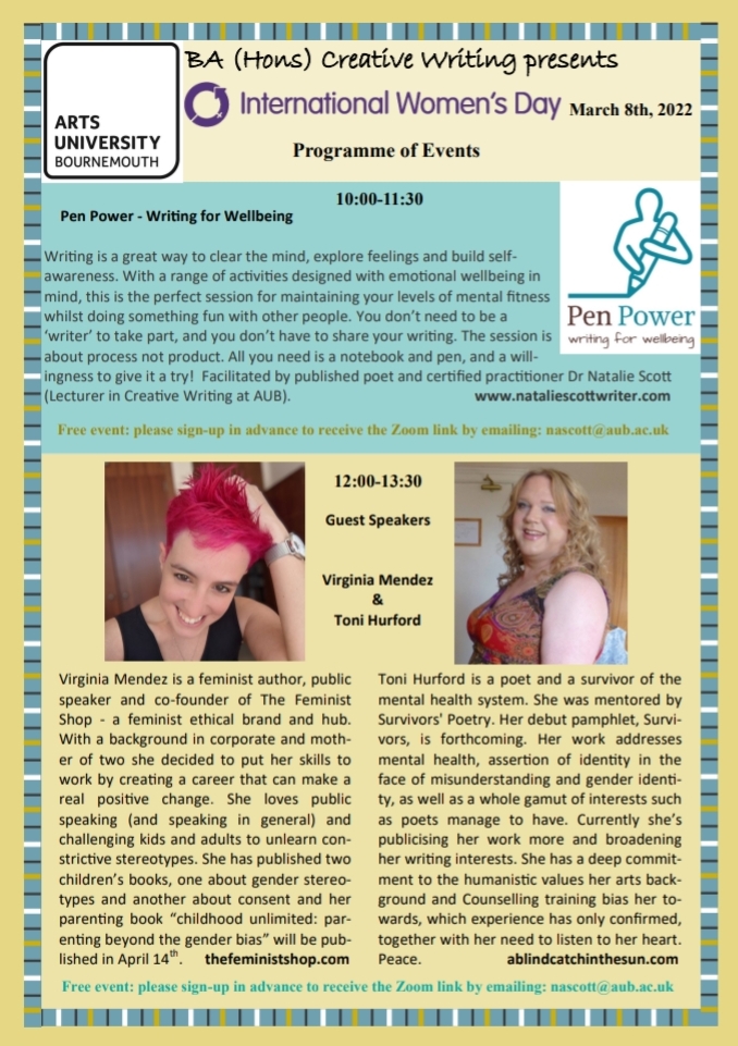 It was a pleasure to curate and host a special day of free online events to celebrate International Women’s Day 2022 for Arts University Bournemouth. The day began with a Pen Power – Writing for Wellbeing session, then we welcomed four inspirational guests, Virginia Mendez, Toni Hurford, The Tees Women Poets and Jasmine Gardosi, who read and presented their work. The day came to a triumphant close with our open mic Wordly Women, organised by our amazing AUB Creative Writing students Robyn Hill and Naomi McClaughry.